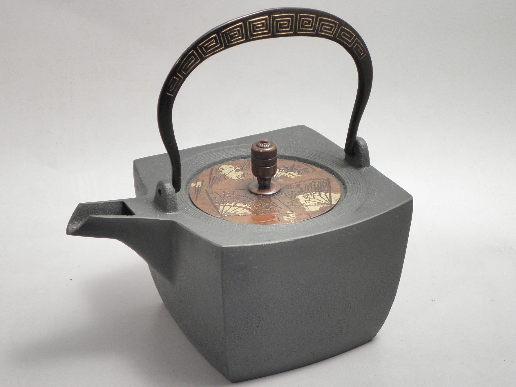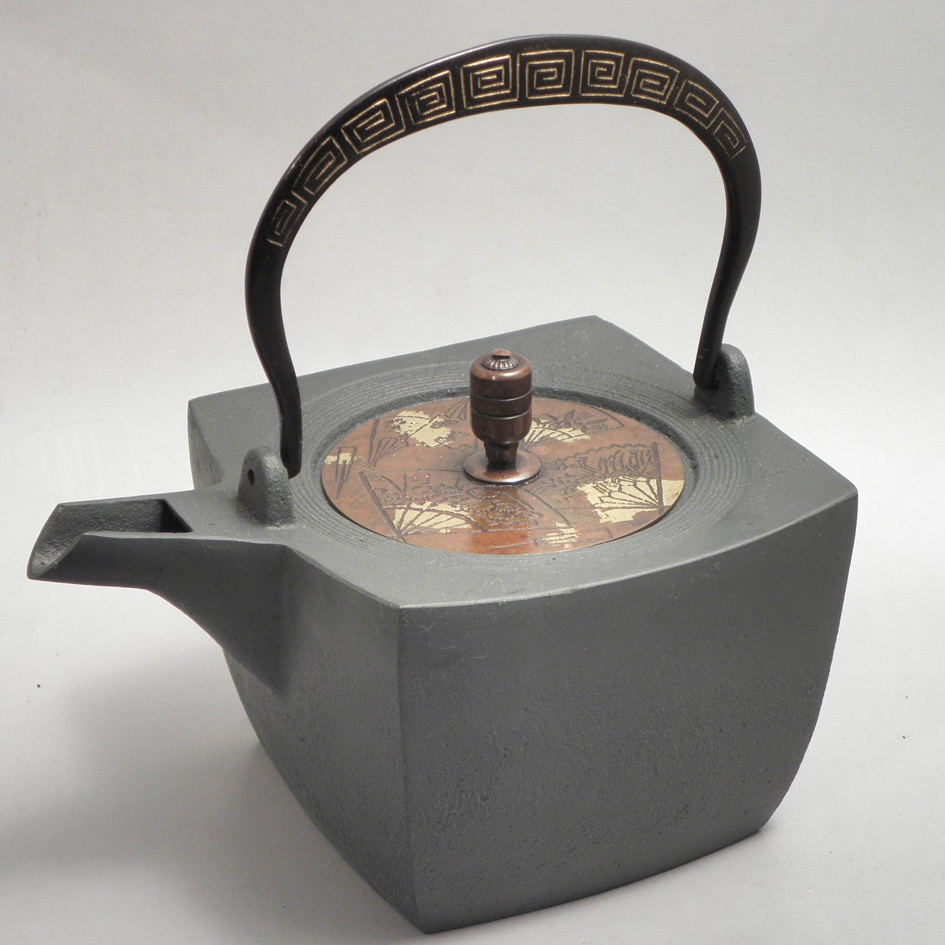 This is an iron pot with a square shape. The strings are cast with a heroic . The lid is a double cover, with the copper part plated in silver and adorned with auspicious patterns of brocade. The ceramic cover features a painting of landscapes, allowing you to choose based on your mood. It also comes with a tea strainer, making it versatile for both tea and wine.