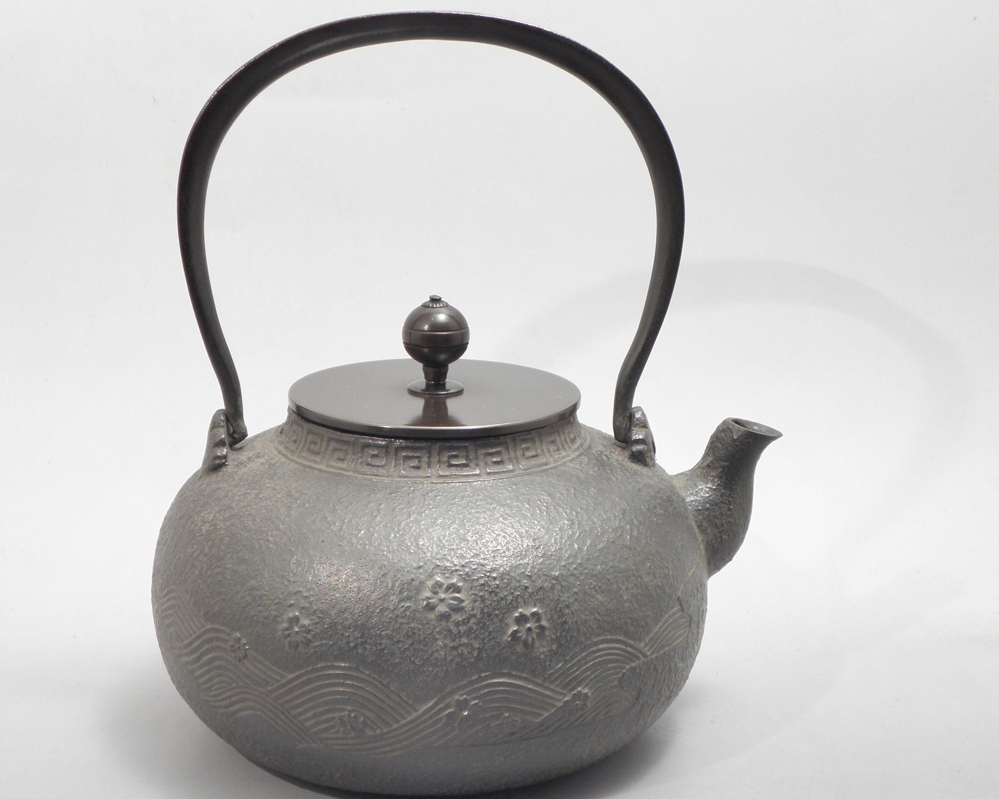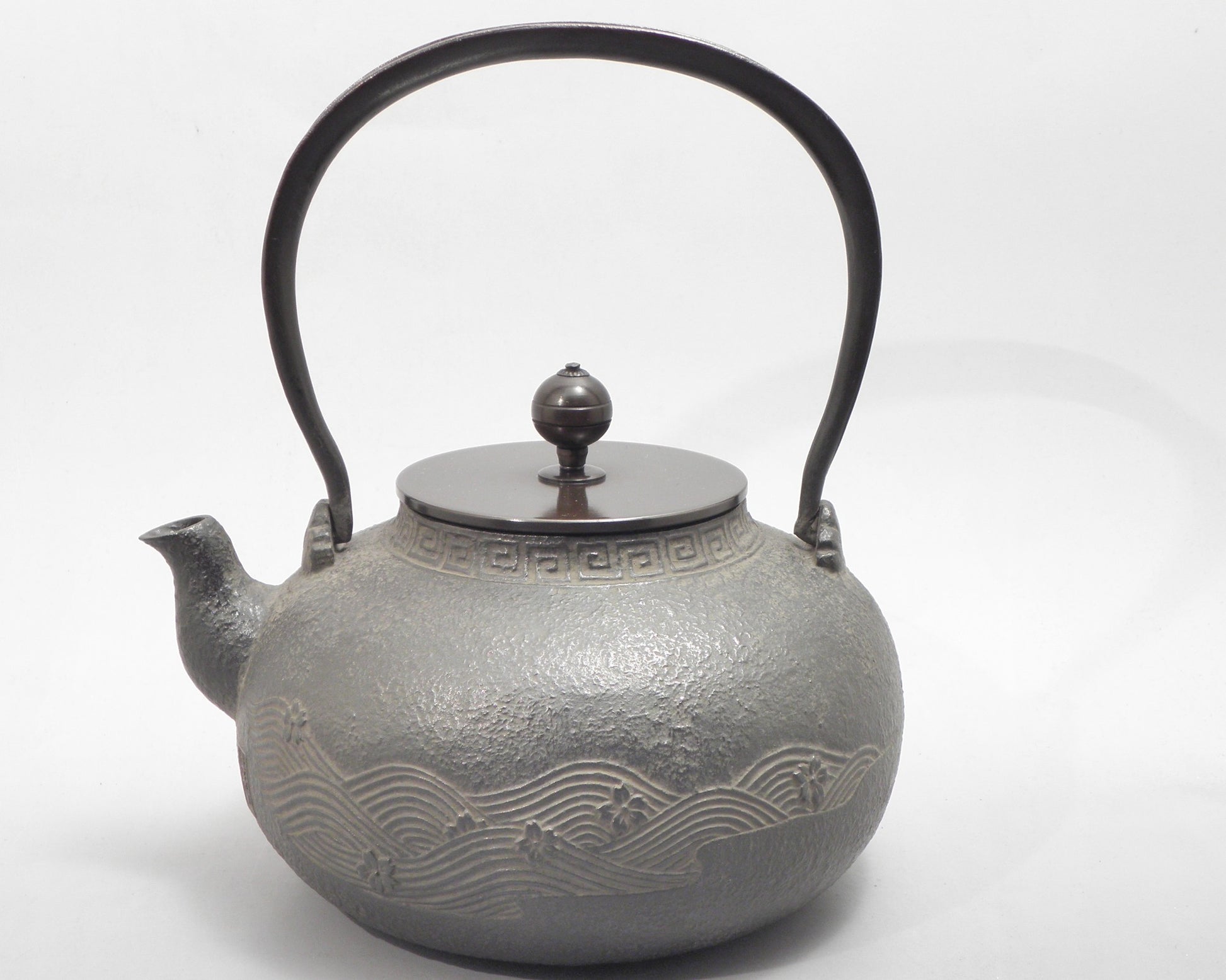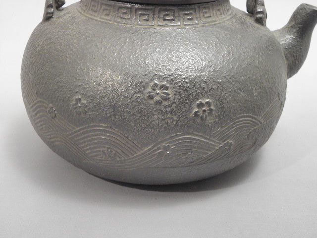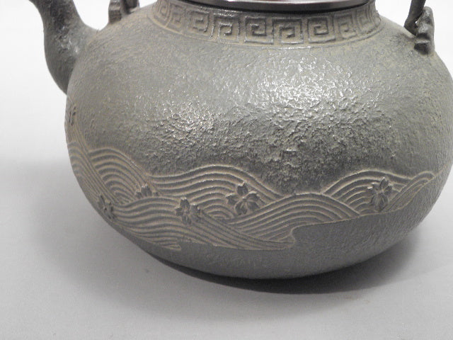 自古以来就被人喜爱象征日本的樱花。越过寒冬花团锦簇的盛开它的美给人带来春天的欢乐得到人们的青睐。在传统图案中也属特殊的流水图案。源源不断且不停留一瞬即消失的样子形象化的表现出来,所以属于很少见的传统图案之一。流淌的水清澈而不浑浊寓意着苦难、灾难等随着流水而去的吉祥图纹。此两物描绘在一起就称为樱川地纹。本作品就铸造出这种樱花和流水。另外,铜制的提手上也同样铸造了流水花纹,令其更加充满了气度。